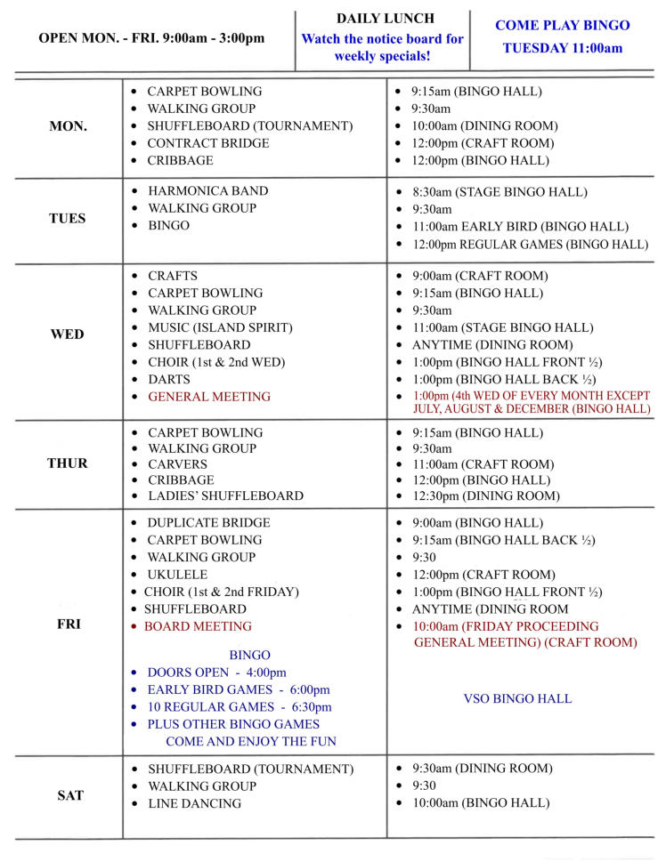 The following schedule shows all the wonderful activities available throughout